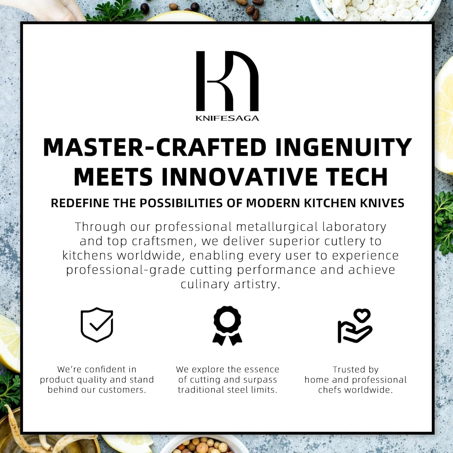 - Confidence in Every Cut: KnifeSaga has developed an innovative steel with optimized structural composition and carbon content. Each blade features an incredibly sharp 10° cutting edge, ensuring every slice is smooth, swift, and precise.