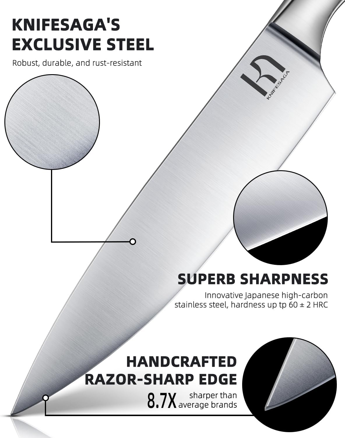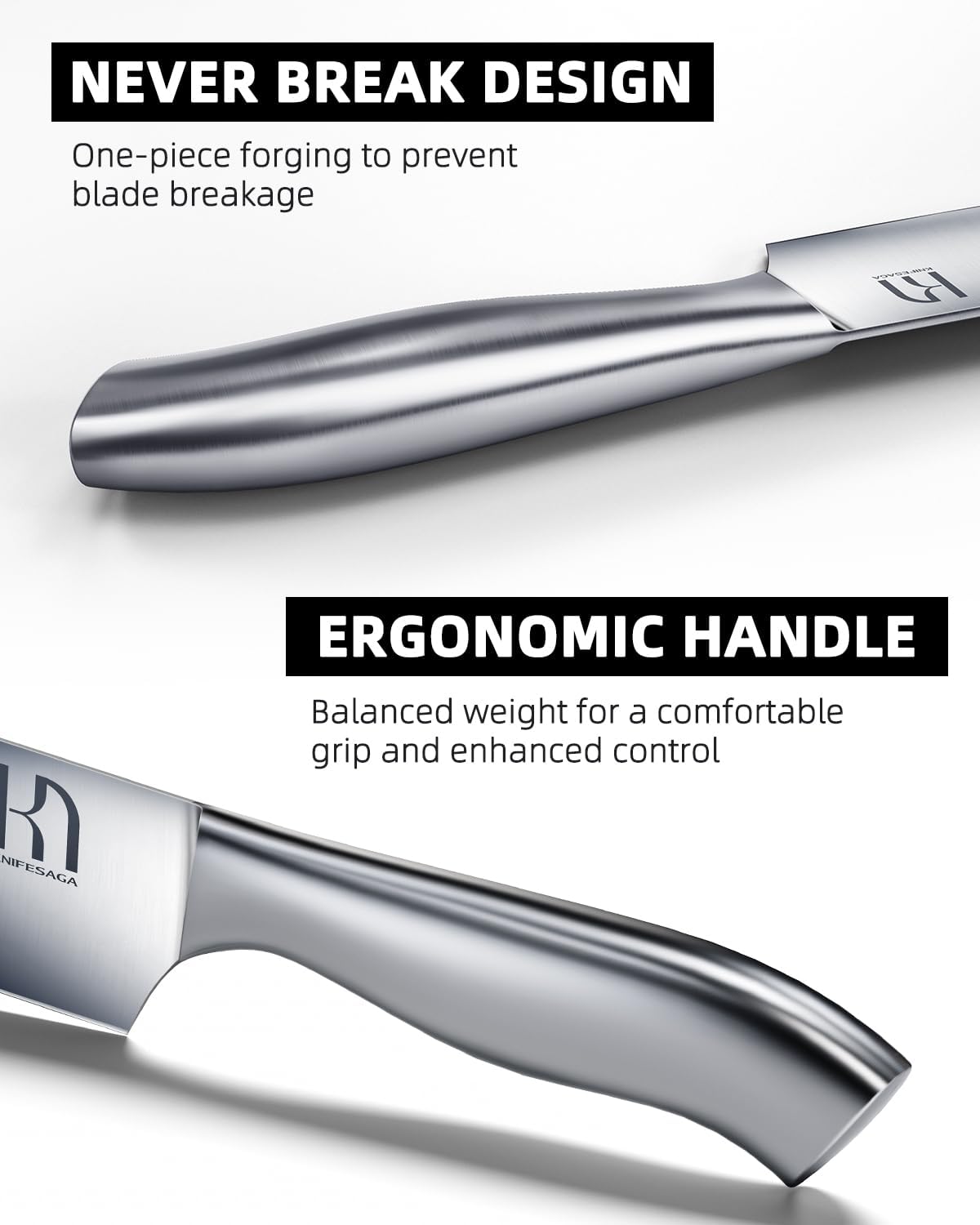 - Confidence in Every Cut: KnifeSaga has developed an innovative steel with optimized structural composition and carbon content. Each blade features an incredibly sharp 10° cutting edge, ensuring every slice is smooth, swift, and precise.